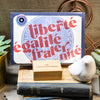 Beautiful Liberty Equality Fraternity card, created from the vintage engraving of a coin struck by the Sower, symbol of the Republic generously sowing its ideas and values among the fertile people, with the words Liberty, Equality, Fraternity printed superimposed.